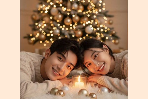 Giữa hai người có một chiếc nến nhỏ đặt trong lọ thủy tinh tỏa ánh sáng vàng dịu. Xung quanh là vài món đồ trang trí Giáng Sinh lấp lánh, phản chiếu ánh đèn ấm áp. Phía sau là cây thông lớn trang trí bằng đèn nhấp nháy và châu vàng trắng, tạo hiệu ứng bokeh lung linh rất mơ màng.