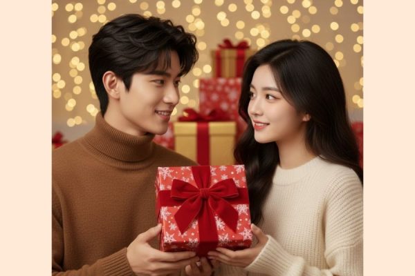 Hãy tạo một bức ảnh cận cảnh siêu chân thật về khoảnh khắc cặp đôi trao nhau món quà Giáng Sinh, dựa trên ảnh gốc và giữ nguyên hoàn toàn gương mặt, màu da và kiểu tóc. Chàng trai mặc áo len cổ lọ màu nâu ấm áp, mỉm cười trìu mến khi trao hộp quà cho cô gái. Cô gái diện áo len dày màu kem hoặc trắng mềm, tóc dài gợn sóng và nhìn lại anh bằng ánh mắt yêu thương.