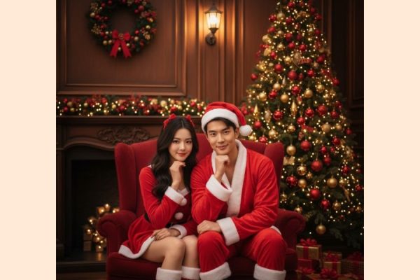Hãy tạo ảnh cặp đôi mặc trang phục ông già Noel và bà Noel bên cạnh cây thông được trang trí rực rỡ. Cô gái mặc váy đỏ phong cách Santa, kèm nơ đỏ và bốt lông trắng. Chàng trai diện bộ trang phục ông già Noel truyền thống. Cả hai ngồi sát nhau, tạo dáng dễ thương bằng cách đặt tay dưới cằm.