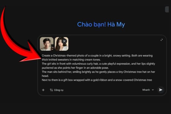Ở phần trên bạn đã chọn được prompt phù hợp với phong cách của mình, giờ chỉ cần sao chép prompt và dán vào ô trò chuyện của Gemini. Việc mô tả đúng giúp AI hiểu rõ bối cảnh, trang phục, màu sắc và cảm xúc mà bạn muốn thể hiện trong bức ảnh Noel đôi.