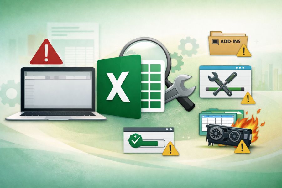 Lỗi mở file Excel nhưng không hiển thị dữ liệu thường xuất phát từ các thiết lập trong phần mềm hoặc xung đột hệ thống khi Excel hoạt động. Trong nhiều trường hợp, dữ liệu thực tế vẫn còn nguyên nhưng chương trình không thể hiển thị đúng trên màn hình. Dưới đây là những nguyên nhân phổ biến nhất khiến file Excel mở ra chỉ thấy màn hình trắng hoặc xám mà người dùng thường gặp.