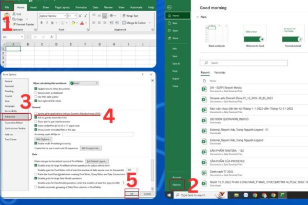 Sau khi hoàn tất, hãy đóng Excel và mở lại file cần sử dụng. Trong nhiều trường hợp, chỉ cần tắt tính năng DDE là bạn đã có thể khôi phục lại dữ liệu hiển thị bình thường.
