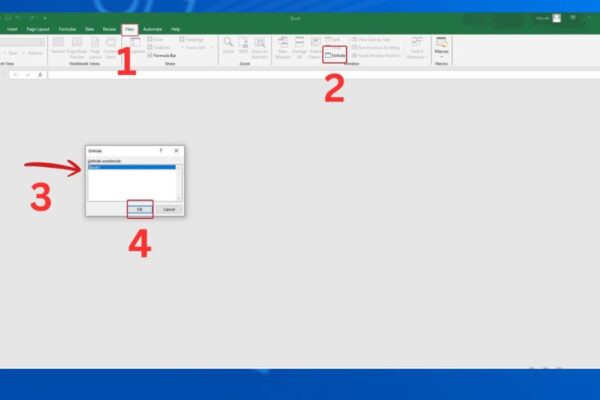Nếu bạn mở file Excel nhưng chỉ thấy màn hình trống, rất có thể trang tính trong file đang bị ẩn. Điều này thường xảy ra khi người dùng vô tình sử dụng tính năng Hide để ẩn sheet hoặc cửa sổ workbook. Trong trường hợp này, dữ liệu thực tế vẫn còn nguyên trong file nhưng không hiển thị trên giao diện làm việc.
