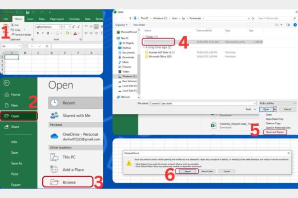 Trong trường hợp bạn đã thử nhiều cách nhưng file Excel vẫn mở ra trắng hoặc không hiển thị dữ liệu, rất có thể file đã bị lỗi cấu trúc do tắt máy đột ngột, mất điện hoặc quá trình lưu file bị gián đoạn. Lúc này, bạn có thể sử dụng tính năng Open and Repair được tích hợp sẵn trong Excel để kiểm tra và sửa lỗi file. Đây là công cụ giúp Excel tự động quét và khôi phục các phần dữ liệu có thể đọc được trong tập tin bị hỏng.