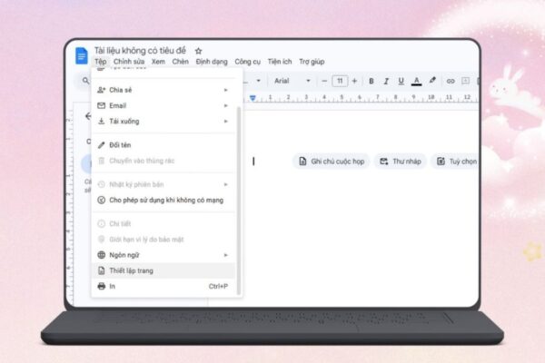 Để thực hiện, hãy nhấn vào mục “Tệp” (File) trên thanh công cụ, sau đó chọn “Thiết lập trang” (Page setup). Khi cửa sổ cài đặt xuất hiện, chuyển sang tab “Không có trang” (Pageless) rồi nhấn OK để xác nhận. Sau khi kích hoạt chế độ này, không gian làm việc trong Google Docs sẽ trở nên rộng rãi hơn, tạo điều kiện thuận lợi để chèn ảnh bìa kích thước lớn
