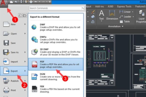 Ngoài cách sử dụng lệnh Plot, AutoCAD còn cung cấp thêm tính năng Export PDF giúp xuất bản vẽ nhanh chóng hơn. Phương pháp này đặc biệt phù hợp khi bạn chỉ cần chuyển đổi file mà không cần thiết lập quá nhiều thông số.