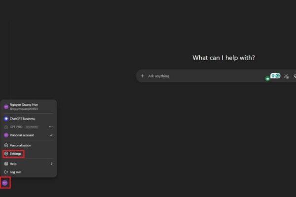 Tại giao diện chính của ChatGPT, hãy nhìn xuống góc dưới bên trái màn hình, nơi hiển thị tên tài khoản hoặc ảnh đại diện (avatar) của bạn. Nhấn vào khu vực này để mở menu tùy chọn.