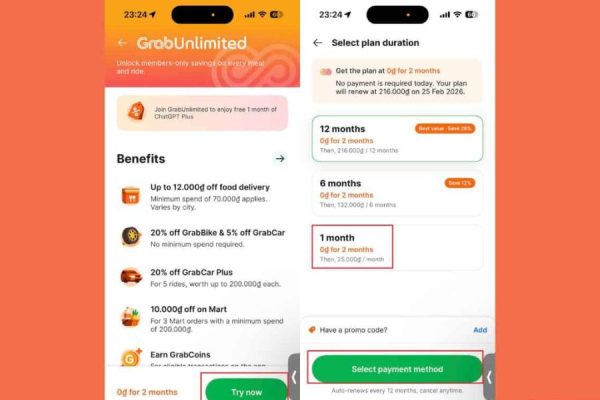 - Đối với người dùng mới: Nếu bạn chưa từng đăng ký Grab Unlimited, bạn sẽ được hưởng thời gian dùng thử miễn phí lên đến 2 tháng. Đây là giai đoạn “vàng” để bạn vừa trải nghiệm toàn bộ tiện ích của Grab Unlimited, vừa tận dụng ưu đãi đi kèm như ChatGPT Plus mà không cần thanh toán bất kỳ khoản phí nào. Chỉ cần đăng ký đúng gói, các quyền lợi sẽ tự động được mở.