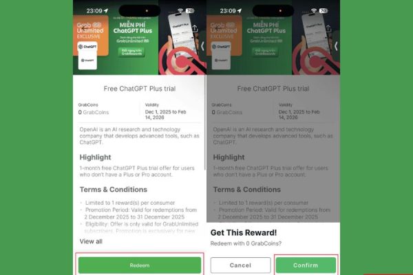 Trong giao diện chi tiết ưu đãi ChatGPT Plus, bạn nhấn vào nút Đổi thưởng (Redeem). Grab sẽ yêu cầu bạn Xác nhận (Confirm) lại thao tác nhằm đảm bảo bạn chủ động sử dụng ưu đãi này.