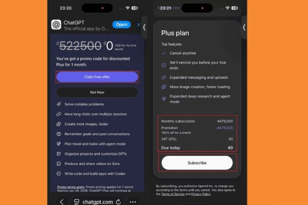 Sau khi đăng nhập, màn hình sẽ hiển thị gói ChatGPT Plus với giá 0đ. Bạn chỉ cần nhấn Claim free offer, sau đó chọn Subscribe để hoàn tất đăng ký. Khi hệ thống xác nhận thành công, tài khoản ChatGPT của bạn sẽ được nâng cấp lên Plus mà không phát sinh chi phí thanh toán.
