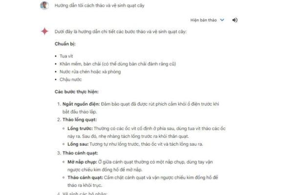 Ví dụ câu lệnh: Hướng dẫn tôi cách tháo và vệ sinh quạt cây