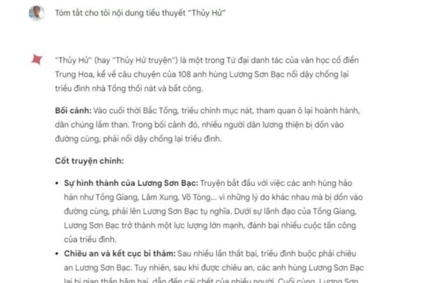 Ví dụ câu lệnh: Tóm tắt cho tôi nội dung tiểu thuyết “Thủy Hử”