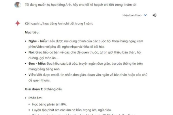 Ví dụ câu lệnh: Tôi đang muốn tự học tiếng Anh, hãy cho tôi kế hoạch chi tiết trong 1 năm tới.
