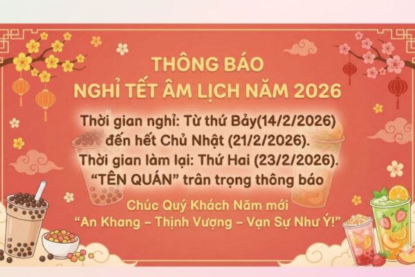 Tạo poster thông báo nghỉ Tết Âm lịch 2026 cho quán trà sữa “TÊN QUÁN”, phong cách vui tươi – ngọt ngào – ấm áp.