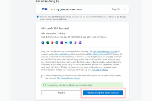 1.9 Bước 9: Kích hoạt ưu đãi 12 tháng bằng tùy chọn “Bắt đầu dùng thử, thanh toán sau”