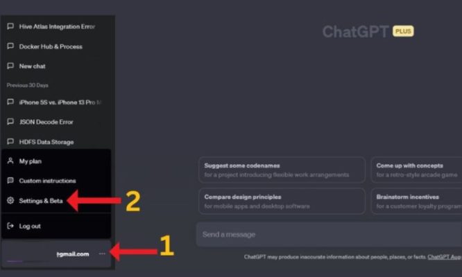 Sau khi đăng nhập thành công, tại giao diện chính của ChatGPT, hãy chú ý góc dưới bên trái màn hình. Bạn sẽ thấy phần hiển thị tài khoản email đang đăng nhập. Nhấn vào địa chỉ email này, một bảng tùy chọn sẽ xuất hiện. Trong danh sách này, hãy chọn mục “Setting & Beta”.