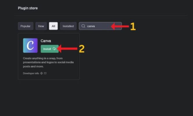 Khi giao diện Plugin Store mở ra, bạn sẽ thấy một thanh tìm kiếm ở phía trên cùng. Hãy nhập từ khóa “Canva” vào ô tìm kiếm, hệ thống sẽ nhanh chóng hiển thị kết quả liên quan. Khi biểu tượng ứng dụng Canva xuất hiện, nhấn vào “Install” để bắt đầu quá trình cài đặt.