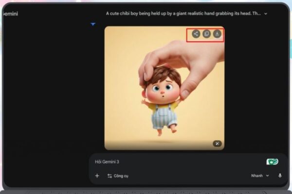 - Prompt mẫu tiếng Anh “A cute chibi girl being held up by a giant realistic hand grabbing its head. The character is hanging in the air, dangling legs, cute confused expression. 3D Pixar style, high detail, solid pastel background.”