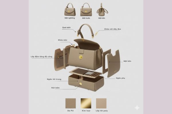 - Toàn bộ nhãn chú thích phải được viết bằng tiếng Việt có dấu và sử dụng đúng thuật ngữ kỹ thuật trong ngành túi xách. Ở hàng trên cùng, hiển thị ba góc nhìn bổ sung gồm mặt trước, mặt sau và mặt bên để người xem hình dung tổng thể kiểu dáng túi. Phần dưới của sơ đồ thể hiện thêm các mẫu chất liệu (texture swatches) như da PU, kim loại khóa cao cấp và vải poly dùng cho lớp lót bên trong.