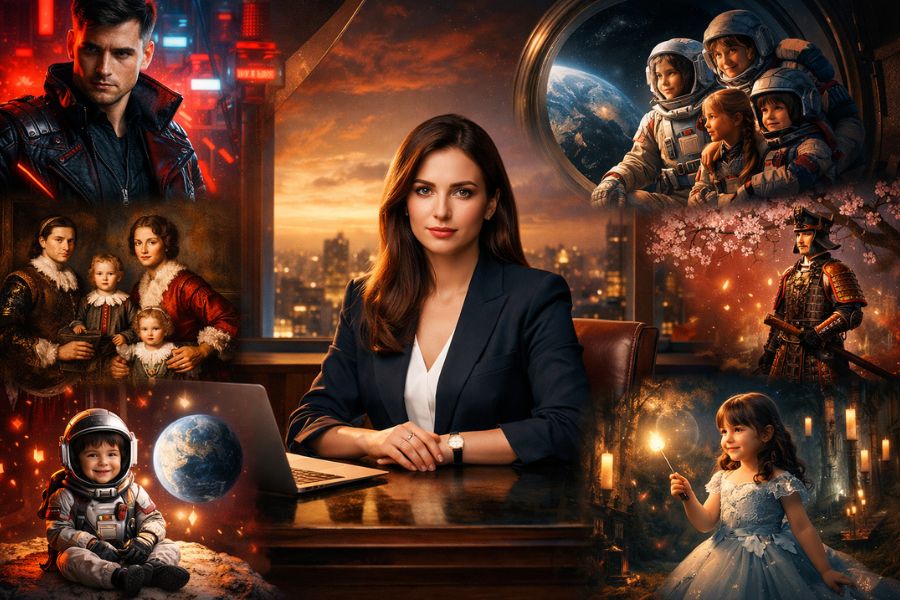 - Một nữ CEO đứng trên sân thượng của tòa nhà chọc trời vào thời điểm hoàng hôn. Tay cầm ly rượu vang, trang phục là suit thanh lịch hoặc váy dạ hội. Phong cách ảnh cinematic khiến hậu cảnh thành phố trở nên mờ ảo, tạo ra không khí sang trọng và bí ẩn.