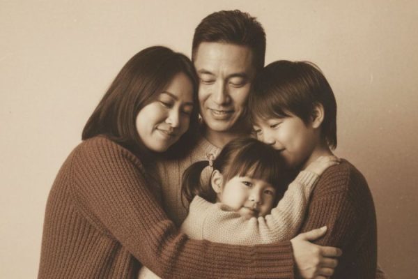 - Một gia đình 4 người gồm bố, mẹ và hai con đang ôm nhau thân mật trong một khoảnh khắc rất tự nhiên. Từng gương mặt đều thể hiện sự kết nối ấm áp, giống như một tấm ảnh được chụp giữa những phút giây đời thường hạnh phúc. Phong cách Polaroid cổ điển giúp bức ảnh trở nên mềm mại với tông màu ấm và độ tương phản nhẹ. Nền studio màu be kem tạo cảm giác gần gũi, tinh tế, giúp chủ thể nổi bật mà vẫn giữ lại vẻ đẹp nhẹ nhàng của phong cách hoài niệm.