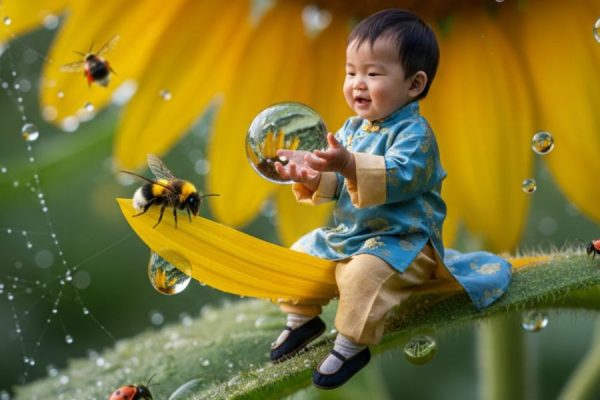 - Một em bé thu nhỏ kích thước tí hon đang ngồi trên cánh hoa hướng dương khổng lồ giữa khu vườn rực rỡ và cầm trên tay một giọt sương long lanh. Góc chụp Macro cho phép thể hiện rõ từng chi tiết như cấu trúc cánh hoa, giọt nước và côn trùng nhỏ. Phong cách siêu thực mang lại cảm giác như bước vào thế giới kỳ diệu của thiên nhiên.