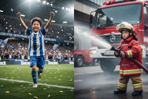 - Một cậu bé khoảng 8 tuổi trong bộ đồng phục bóng đá hoặc bóng rổ, đang ăn mừng chiến thắng giữa sân vận động rực sáng. Góc chụp hành động cho cảm giác mạnh mẽ, tốc độ cao, kết hợp ánh sáng chói trên sân tạo nên bức ảnh siêu thực.