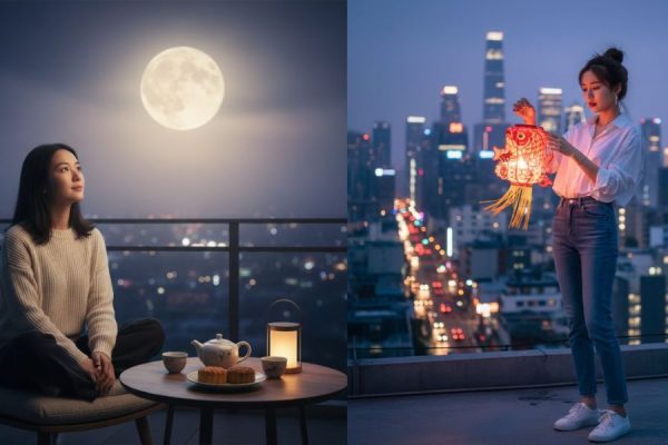 - Một người đang ngồi thưởng trà trên ban công đêm trăng. Trên bàn có ấm trà và bánh trung thu. Cả không gian phủ một lớp sương nhẹ tạo nên sự tĩnh lặng và sâu lắng. Ánh sáng dịu khiến bức ảnh mang phong cách tối giản nhưng rất tinh tế.