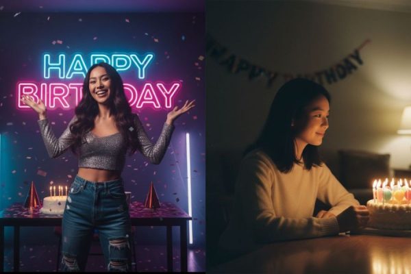 - Một chân dung dự tiệc sang trọng, nhân vật mặc vest đen hoặc đầm dạ hội đứng trước số tuổi làm bằng đèn LED lớn. Ánh sáng kịch tính và tương phản cao giúp ảnh mang khí chất quyền lực.
