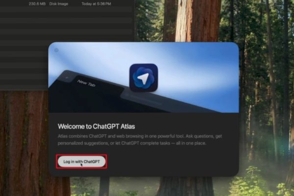 Khởi chạy ChatGPT Atlas, bạn sẽ thấy màn hình chào mừng. Nhấp vào “Đăng nhập bằng ChatGPT (Log in with ChatGPT)” ở cuối trang.
