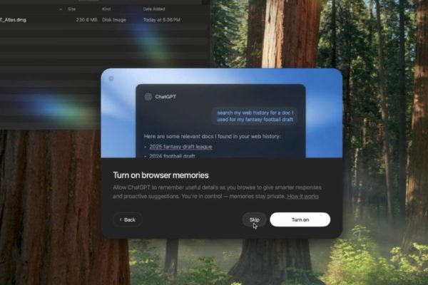 ChatGPT Atlas sẽ hỏi bạn có muốn bật tính năng ghi nhớ trình duyệt không. Nếu bật, ứng dụng sẽ lưu lại ngữ cảnh duyệt web để hỗ trợ phản hồi thông minh hơn. Bạn có thể chọn “Bật (Turn on)” hoặc “Bỏ qua (Skip)”, và thay đổi tùy chọn này bất cứ lúc nào trong cài đặt.