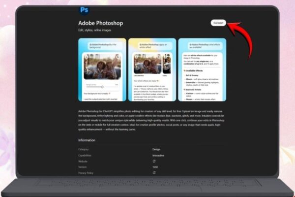 Ở trang thông tin của Adobe Photoshop, bạn sẽ thấy nút Connect nằm ở góc phải màn hình. Nhấn vào nút này để bắt đầu quá trình liên kết giữa ChatGPT và tài khoản Adobe của bạn.