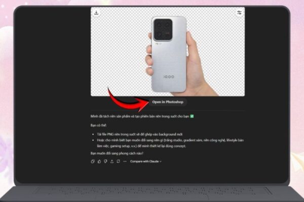 Nếu cần chỉnh thêm, chỉ cần nhập yêu cầu bổ sung mà không phải tải lại từ đầu. Ngoài ra, bạn có thể tải file PNG nền trong suốt về máy hoặc nhấn Open in Photoshop để tiếp tục chỉnh sửa chuyên sâu hơn trên nền tảng Adobe khi cần thiết.