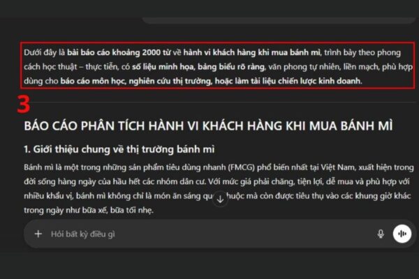 - Yêu cầu cấu trúc báo cáo rõ ràng: Bạn có thể đề nghị ChatGPT trình bày nội dung theo H2, bullet point, bảng so sánh hoặc danh sách để bài báo cáo dễ đọc và logic hơn.