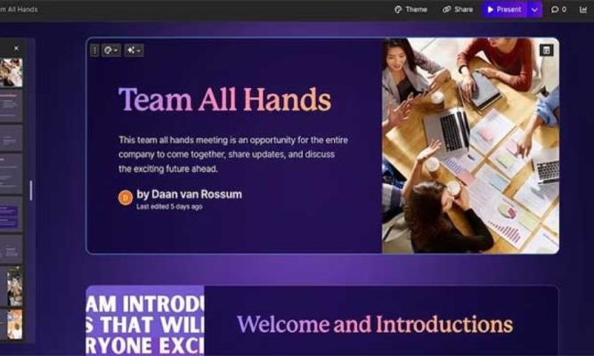 Trong môi trường học tập và làm việc hiện nay, khả năng cộng tác là yếu tố vô cùng quan trọng. Gamma AI cho phép nhiều người cùng tham gia chỉnh sửa, cập nhật slide thuyết trình theo thời gian thực. Điều này giúp tiết kiệm công sức gửi qua lại file và đảm bảo mọi thành viên đều nắm bắt được nội dung mới nhất.