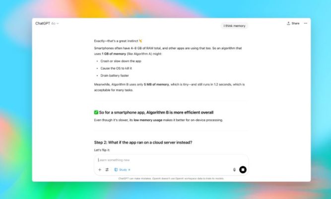 Ngoài ra, chế độ học tập còn mang tính linh hoạt cao, dễ dàng bật hoặc tắt trong quá trình trò chuyện, phù hợp với nhiều nhu cầu khác nhau. Bạn có thể sử dụng khi muốn tập trung học một chủ đề, hoặc tạm tắt để trò chuyện tự do. Việc này giúp học tập trở nên nhẹ nhàng, thú vị và cá nhân hóa hơn, biến ChatGPT từ một công cụ trả lời thông thường thành “người đồng hành tri thức” đáng tin cậy trong hành trình học tập mỗi ngày.