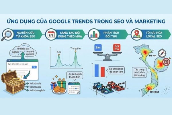 Các ứng dụng thực tế nổi bật của Google Trends trong SEO và Marketing gồm: