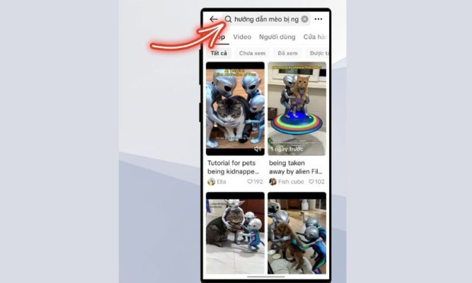 Đầu tiên, bạn hãy mở ứng dụng TikTok và gõ từ khóa tìm kiếm như “mèo bị người ngoài hành tinh bắt” hoặc “Alien Cat CapCut”. Kết quả sẽ hiển thị rất nhiều video đang bắt trend, bạn có thể chọn một video ưng ý để tham khảo.
