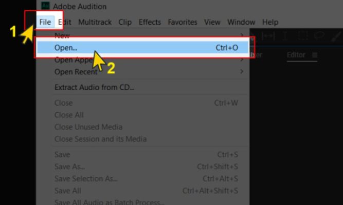 Mở Adobe Audition CS6 và chọn File rồi nhấn Open hoặc dùng tổ hợp phím Ctrl O để tải bài hát cần xử lý. Đây là thao tác khởi đầu quan trọng trong cách tách beat bằng Adobe Audition CS6, vì bạn sẽ làm việc trực tiếp trên waveform của file gốc nên cần đảm bảo đã mở đúng bản nhạc chất lượng cao.