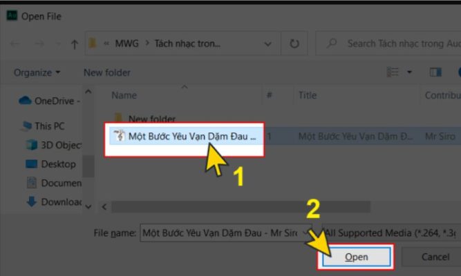 Khi cửa sổ Open hiện lên, tìm đến file WAV hoặc FLAC có chất lượng cao và nhấn Open để nhập vào Audition. Việc chọn file chất lượng cao là yếu tố then chốt trong cách tách beat bằng Adobe Audition CS6 vì file có độ nén thấp giúp công cụ tách giọng và giữ được nhiều chi tiết của beat.