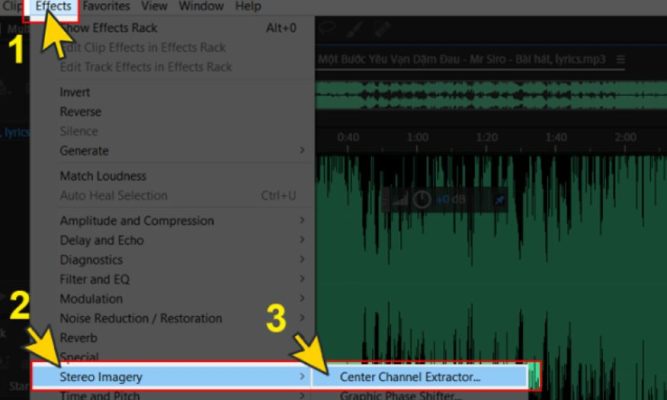 Trên thanh menu, chọn Effects, sau đó vào Stereo Imagery và kích chọn Center Channel Extractor để mở công cụ chuyên dùng cho việc loại bỏ hoặc tách các thành phần ở kênh center. Công cụ này là một trong những bước chính của cách tách beat bằng Adobe Audition CS6 vì nó cho phép bạn can thiệp vào âm thanh ở trường stereo và xử lý phần giọng nằm chính giữa mix.