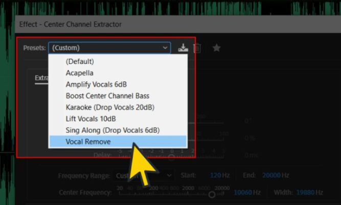 Trong cửa sổ Effects của Center Channel Extractor, ở mục Presets chọn Vocal Remove để phần mềm cố gắng loại bỏ giọng hát chính giữa, từ đó thu được beat sạch hơn. Preset này là lựa chọn phù hợp cho nhiều bản nhạc phổ thông trong hướng dẫn cách tách beat bằng Adobe Audition CS6 tuy nhiên kết quả còn phụ thuộc vào cách mix gốc và đặc điểm giọng hát.
