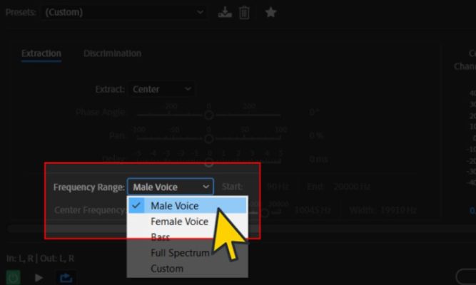 Trong mục Frequency Range, lựa chọn Male Voice hoặc Female Voice tùy theo giới tính giọng ca để giúp công cụ xác định dải tần cần giảm bớt, thao tác này làm tăng hiệu quả trong cách tách beat bằng Adobe Audition CS6. Nam thường có dải tần thấp hơn còn nữ thường tập trung ở dải tần cao hơn, nên chọn đúng option sẽ giảm thiểu tác động lên phần nhạc nền.