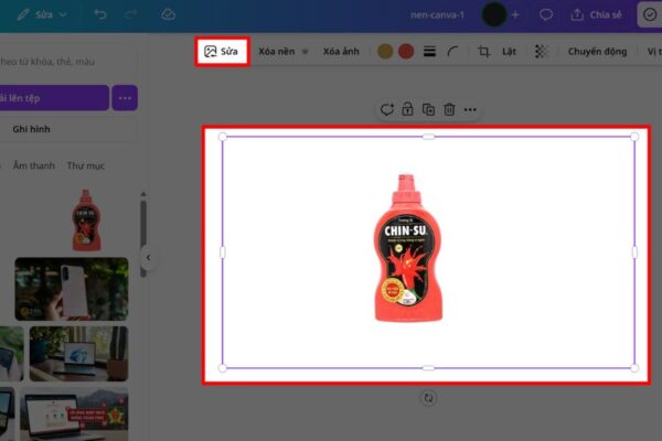 Tiếp theo, bạn nhấn vào mục Sửa (Edit) để mở bảng chỉnh sửa nâng cao. Tại đây, Canva sẽ hiển thị các công cụ thông minh liên quan đến AI, cho phép bạn thực hiện nhiều thao tác như xóa nền, thay đổi ánh sáng hoặc tạo phông nền mới một cách nhanh chóng.