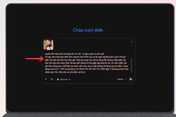 Đây là bước quan trọng nhất, quyết định bức ảnh của bạn mang vibe nàng thơ như thế nào. Prompt không cần quá dài, nhưng cần rõ ràng và tập trung vào cảm giác tổng thể. Thay vì yêu cầu chỉnh sửa từng bộ phận gương mặt, bạn nên mô tả phong cách, ánh sáng, màu sắc và không khí của bức ảnh.