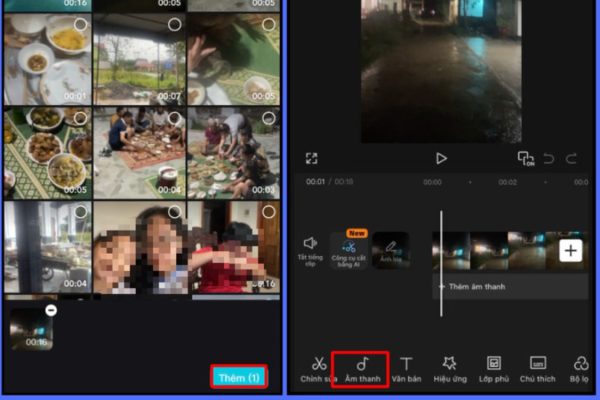 - Bước 2: Chọn đoạn video cần lọc tạp âm → nhấn “Thêm”, sau đó mở phần “Âm thanh” (Audio).