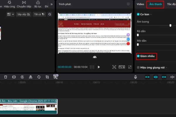 - Bước 3: Trong phần âm thanh, chọn mục “Giảm tiếng ồn” (Noise Reduction) hoặc “Lọc tạp âm” (Remove Noise). Bật công tắc tính năng này rồi xác nhận bằng dấu tích.