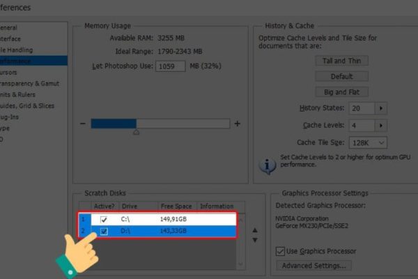 Một trong những cách hiệu quả và nhanh chóng nhất để khắc phục lỗi “Scratch Disks Are Full” là thay đổi vị trí lưu trữ vùng nhớ tạm sang một ổ đĩa khác có dung lượng trống nhiều hơn. Thông thường, Photoshop sẽ mặc định sử dụng ổ C, nơi cài đặt hệ điều hành làm Scratch Disk. Tuy nhiên, ổ này thường dễ bị đầy do chứa nhiều tệp hệ thống và ứng dụng khác. Việc chuyển sang ổ D, E hoặc bất kỳ ổ phụ nào có dung lượng lớn sẽ giúp giảm tải cho ổ chính và cải thiện tốc độ xử lý đáng kể.