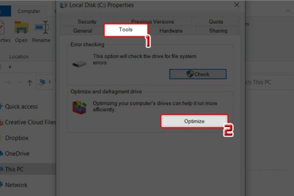 Ngay cả khi ổ đĩa còn dung lượng, phân mảnh mạnh có thể khiến Photoshop không thể sử dụng liên tục vùng trống đó. Để tối ưu, mở This PC, nhấp phải vào ổ đĩa, chọn Properties, chuyển sang tab Tools và tại mục Optimize and defragment drive chọn Optimize. Hệ thống sẽ sắp xếp lại dữ liệu, gom các vùng trống lại gần nhau và cải thiện tốc độ đọc ghi. Sau khi chống phân mảnh, Photoshop sẽ có nhiều vùng trống liên tục để lưu file tạm, giảm nguy cơ gặp lại lỗi Scratch Disks Are Full.