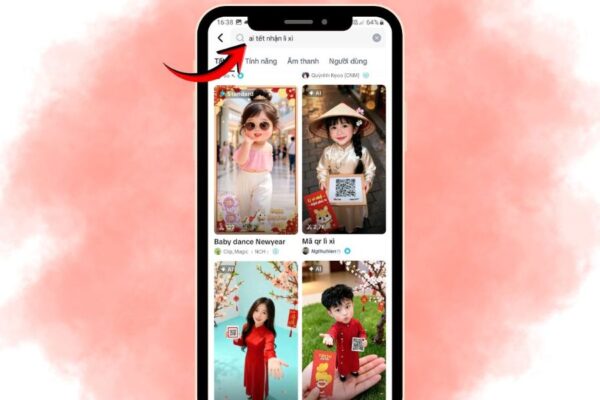 Sau đó nhấn Tìm kiếm để hệ thống hiển thị các mẫu liên quan. CapCut sẽ đề xuất hàng loạt template có hiệu ứng biến hình, phong bao lì xì, Thần Tài hoặc chèn mã QR sẵn.